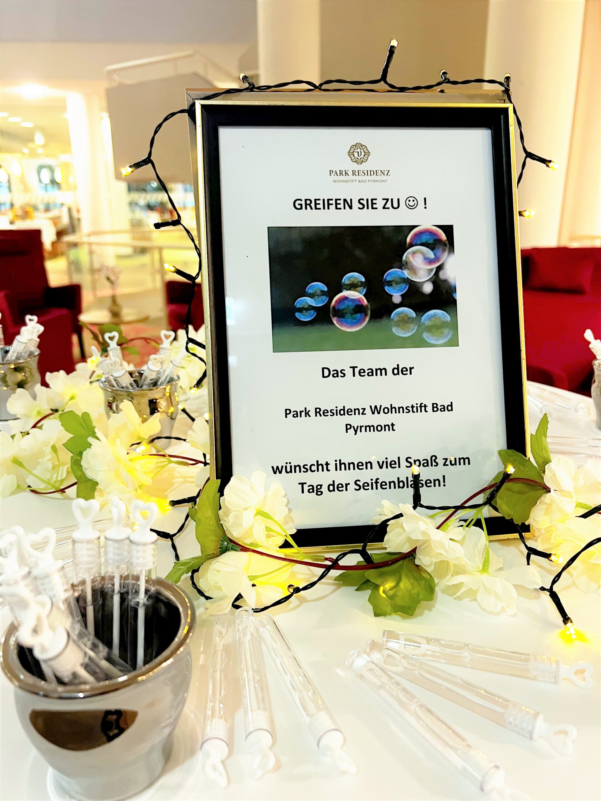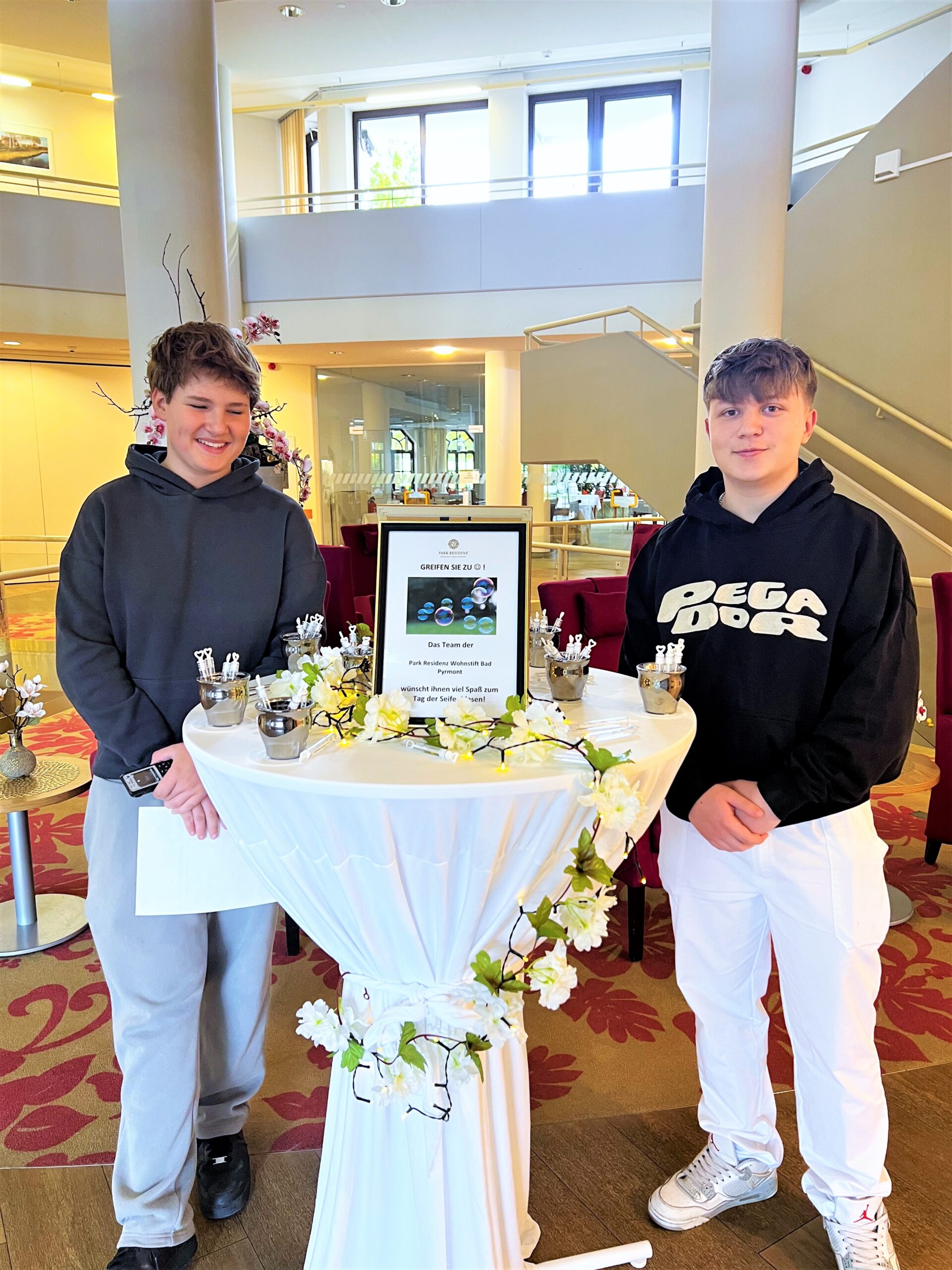 Unsere Azubis Nikita und Jaden verteilten kürzlich kleine Geschenke anlässlich des Tages der Seifenblasen an unsere Bewohner, Mitarbeiter und Gäste. 😁 Es gab für jeden ein mit Seifenlauge gefülltes Fläschchen zum Mitnehmen. Beide waren sich einig: „Dass es so coole Aktionen gibt, ist wirklich einzigartig!“ 🙌